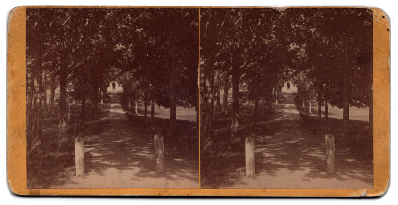 This slightly dense and inscrutable view shows a tree-lined path across the quad, and, I believe, a door to East College at the end.
