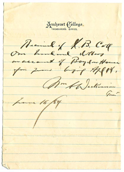 |  | Boyden House Receipt A second receipt from the Amherst College Treasury makes note of another installment of