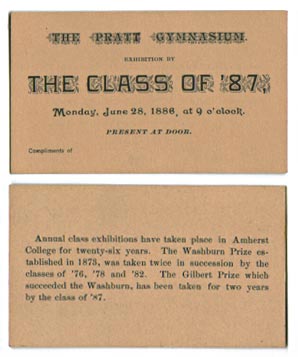 The front and back of a ticket to the Junior Class Exhibition in Pratt Gymnasium. Hardy would have participated, as a member of the Class of 1887.