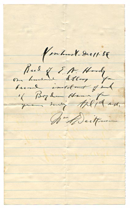 A receipt from William Dickinson certifying that Hardy paid one hundred dollars toward the second installment of rent for the Boyden House, dated December 11, 1886