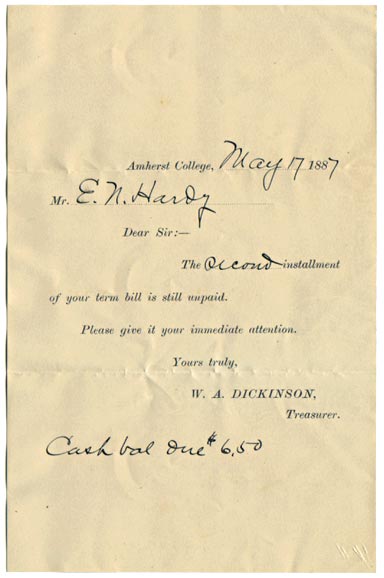 A brief note from the treasurer informing Hardy that he was $6.50 overdue on the second installment of his term bill in the spring of 1887.