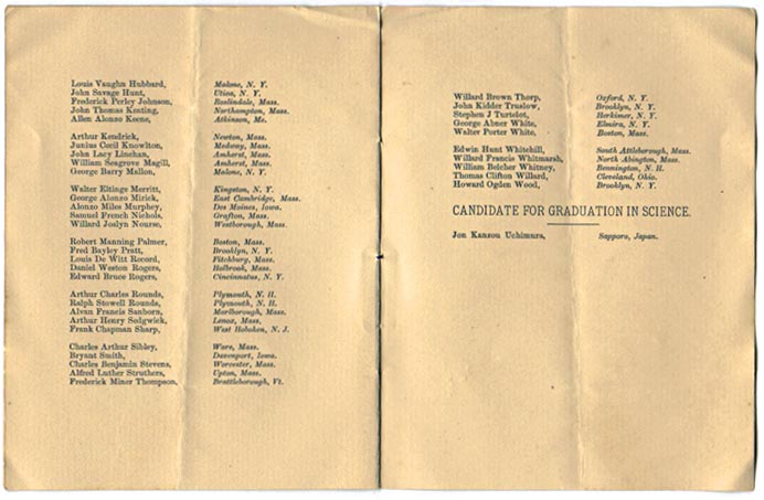 The last two pages of Hardy's Commencement program, with a continued list of the candidates for graduation in Arts, and the lone candidate for graduation in science, Jon Kanzou Uchimuru, of Sapporo, Japan.