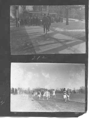 Another portion of a page with photographs of a town tram and a track race, most likely on Pratt Field.