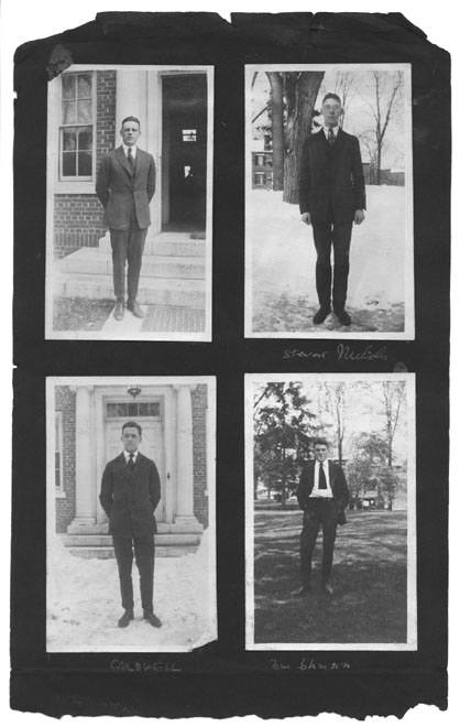 |  | Nichols, Caldwell, and Johnson The fifth page of classmate photos, featuring four more Amherst men: Stewart Burton Nichols, George's brother, is pictured in the upper right, flanked by a photo of an unidentified man. Below them are a man identified as Caldwell, and Tom Johnson, who many recent graduates may know as the late alumnus who made the wonderful wooden trays given as thank you gifts for donations to the Class Gift. |  |  |