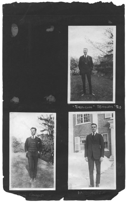 |  | "Deacon" Brown '20, Howie Bassett, and Walt Allen The sixth page of classmate photos, featuring three Amherst men, all identified: "Deacon" Brown '20, Howie Bassett, and Walt Allen, the latter photographed in front of the D. U. House |  |  |