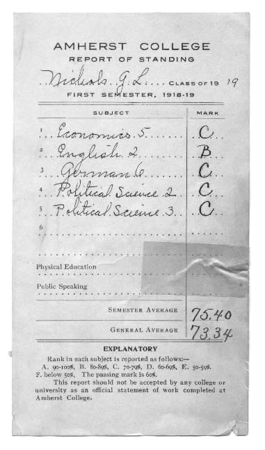 One of a few loose pieces of ephemera in the collection, the grade report for the first semester of Nichols' last year at Amherst.