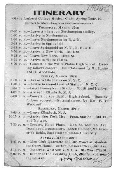 An itinerary for the Music Clubs' Spring 1919 tour.