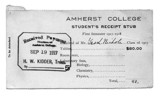 A receipt for $80.00 to pay for the first semester tuition for Nichols' junior year, 1917-1918.