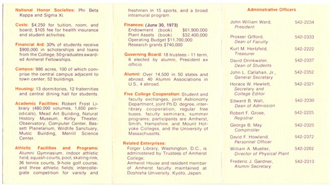 The inside of the 1973 brochure, advertising tuition, room, and board as a startling $4,250.