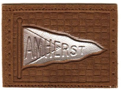 This rectangular leather is embossed with a small purple and white Amherst pennant. It differs slightly from the previous pennant in the background and pennant-pole.